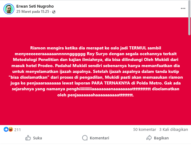 “Rismon mengira ketika dia merapat ke Solo dengan mejadi termul sambil menyerang Roy Suryo dengan segala ocehannya terkait metodologi penelitian dan kajian ilmiahnya, dia bisa dilindungi oleh Mukidi dari masuk hotel prodeo,” kata Erwan dikutip dari akun Facebook pribadinya, dikutip Jumat 27 Maret 2026.